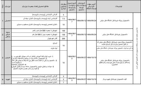 به اطلاع میرساند فرآیند ثبت درخواست وامهای دانشجویی در نیمسال اول سال تحصیلی ۱۴۰۴–۱۴۰۵ از تاریخ ۱۷ آبانماه ۱۴۰۴ لغایت ۲۷ آذرماه ۱۴۰۴، بر اساس جدول زمانبندی اعلامشده برای هر نوع وام انجام خواهد شد.